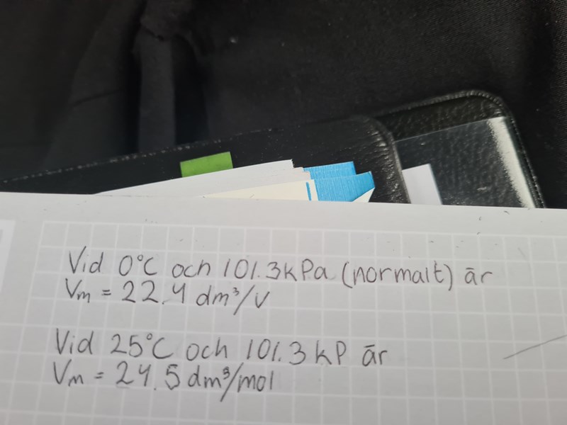 "Högre molvolym innebär att 1 mol av ämnet tar upp större volym. När temperaturen ökar (men inte p) kan vi lista att Vm kommer öka då atomer/molekyler med högre energi rör sig mer och tar därmed upp mer volym"
