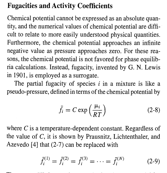Definitionen som framgår i ekv. (2.8) verkar för mig helt tagen ur luften. Vad är motiveringen bakom denna definition? Är detta verkligen den vedertagna definitionen eller är detta ett härlett samband? Jag har svårt att tänka mig att någon bara kom på att det är rimligt att definiera fugacitet enligt det uttrycket, förstås också med en temperaturberoende konstant (för varför inte, liksom? Det är ju kul med lite temperaturberoenden här och där...!).
