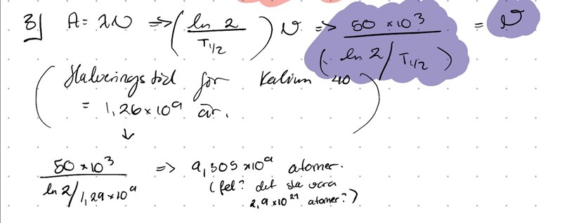 Uppgiften berättar att jag har en bit Kalium 40, och dess aktivitet är 50kBq. Jag ska räkna ut hur många atomer som smulan består av.