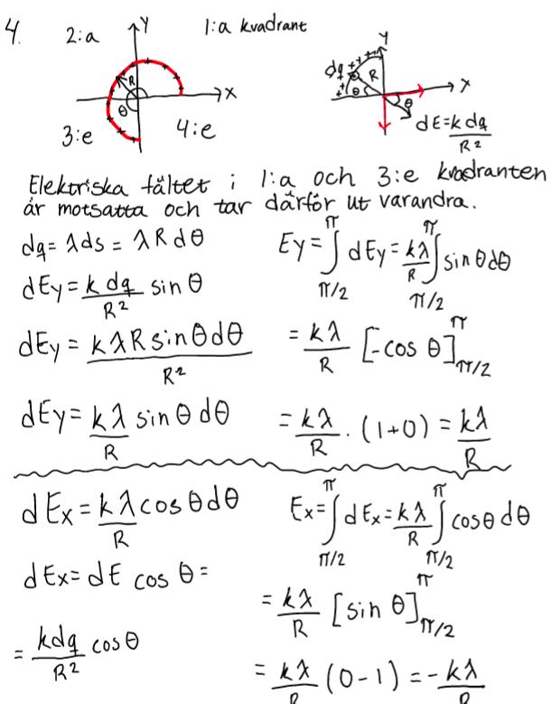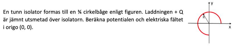Har försökt integrera över 2:a kvadranten men känner mig väldigt osäker på hur man beräknar potentialen och elektriskt fält i origo av en 3/4 cirkel. Förstår inte heller hur man beräknar lambda?