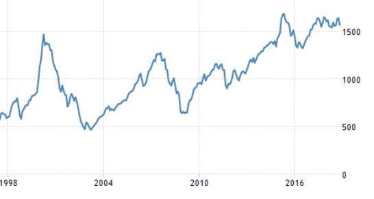 Toppen runt år 2000 var IT bubblan.  Varje topp i diagrammet har en bubbla som förklaring.