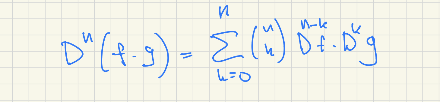 Så den n:te derivatan av produkten av f och = summan (från k=0 till n) av binomialkoefficienten gånger den n-k:e derivatan för f gånger den k:te derivatan av g... hmm... undrar var denna kom från?