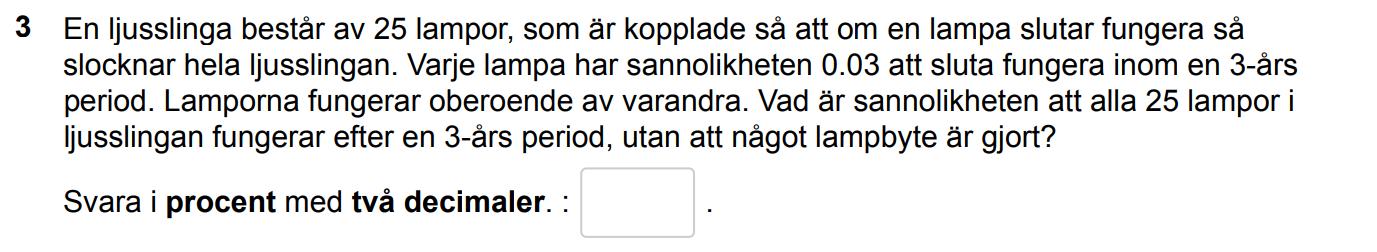 Om du velar: antag att ljusslingan istället hade bestått av 2 lampor. Vilka utfall finns det då och vad är deras sannolikhet? Vilket/vilka utfall är motsvarigheten till den i uppgiften och vad blir dess/deras komplementhändelse?