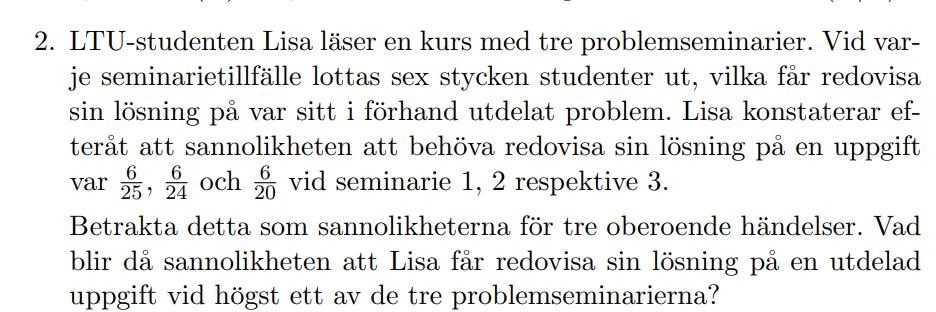 Hej! Jag försökte lösa denna uppgift men får fel svar, jag tänkte att p(Lisa måste redovisa vid max ett seminarie) =