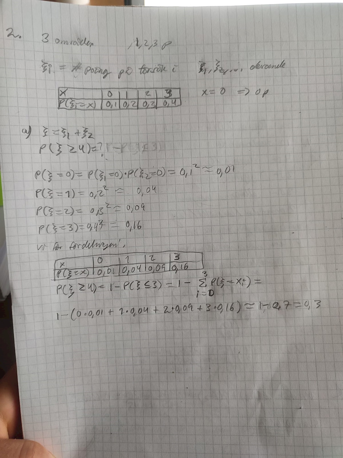 Exemeplvis. Om xi är 1 betyder det att summan av xi1 och xi2 är 1. Det sker när antingen xi1 = 1 och xi2=0, ELLER när xi1 = 0 och xi2=1.Att räkna ut fullständiga fördelningen för xi är nog lite jobbigt. Det är nog enklare att bara räkna ut sannolikheterna för att xi är 5 och 6 (som är de alternativ då xi är större än 4). Xi kan som störst anta 6 eftersom xi1 och xi2 kan vara max 3, och därmed blir summan som störst 6.