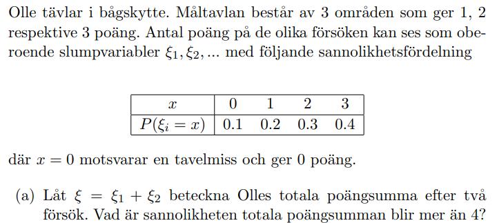 Tänk att A är händelsen att xi1=2 och xi2=3, och B är händelsen att xi1=3 och xi2=2. Då är P(xi=5)=P(A union B) = P(A) + P(B) -P(A snitt B) = P(A) + P(B) eftersom A och B kan inte ske samtidigt och därför är P(A snitt B)=0.Ah okej det är sannt tack! Men även om jag ska addera P(A)+P(B) så måste jag beräknat deras individuella sannolikheter fel efter som jag fick fram att P(A)=P(B)=0,12 så vi får P(A)+P(B)=0,12+0,12 = 0,24 Men svaret är 0,4:(