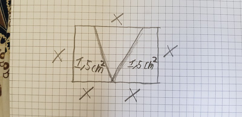 På grund av att b*h av den t.ex vänstra delen av figuren = x*x = 1,5cm^2 vilket kan skrivas om som: x^2 = 1,5cm^2