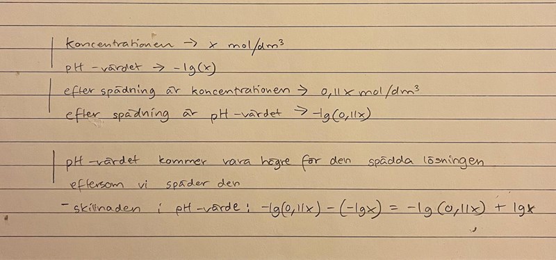 [H3O+] före spädning: x pH före spädning: -lg(x) = pH