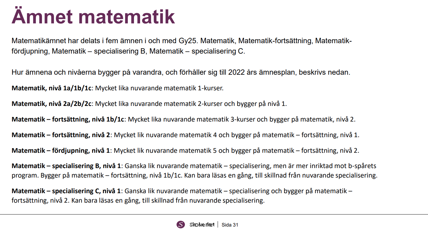 Förvirringen är eftersom Skolverket har gjort en hel del förändringar i gymnasiets ämnesplaner i matematik i nya läroplanen GY25. Såhär ser det ut: