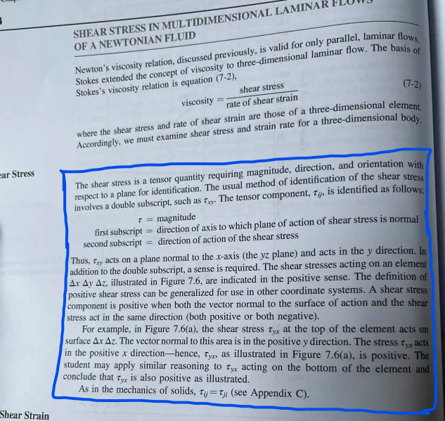 Tydligen är shear stress i sig en tensor (tydligen inte längre ett element ur spänningstensorn...?) och tydligen ska man också ha riktning...?! Men sedan i andra sammanhang så räknar man med skjuvspänningen som om det vore en skalär, t.ex. i exemplet på bara nästa sida