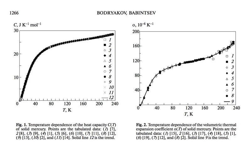 Hmm. Jag förnimmar ingen diskontinuitet i vk i tabellerna vid smälttemperaturen 234 K vilket förefaller lite överaskande men det kanske inte är så att vi förväntar oss diskontinuiteter i VK för metaller vid fasövergångar. Har ju inte så djupa kunskaper om termofysik för metaller precis.