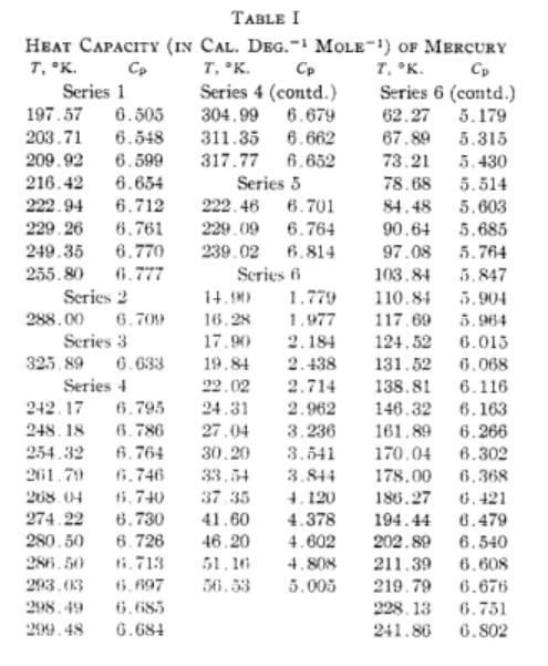 R. H. Busey och W. F. Giauque (1953), The Heat Capacity of Mercury from 15 to 330°K