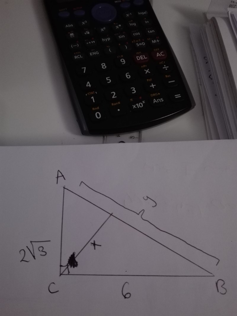 När du räknat ut exakt värde på y, så kan du använda dig av likformighet, eller räkna ut arean av stora triangeln på två olika sätt, båda metoderna ger samma svar, och i stort sett samma beräkningar.