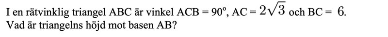 jag försökte lösa det genom likformighet men det gick inte. Dessutom vet jag inte hur jag ska använda mig av 90 graders vinkeln när jag får inte använda miniräknare på provet så jag struntade i att lösa det trigonometriskt.