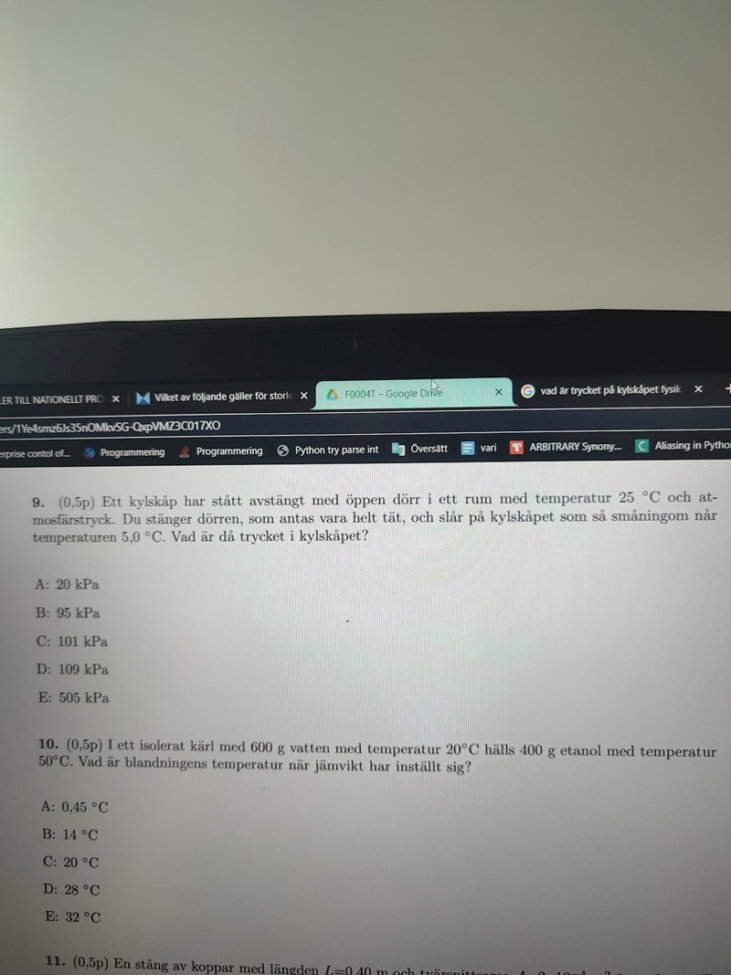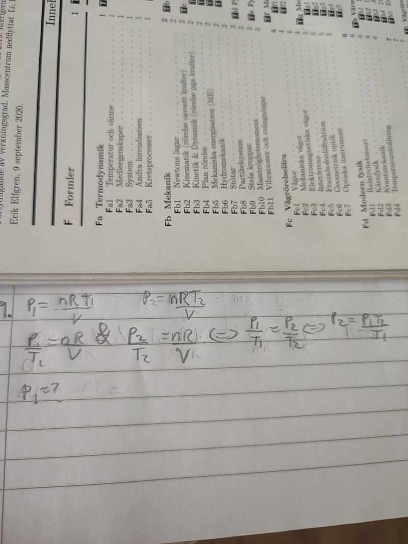 Hej! Jag försöker lösa fråga 9 på en gammal tenta men kommer inte vidare:( känns som jag har få variebler att arbeta med:( jag har kommit fram till att P2 = p1*T2/T1. Jag vet både T2 och T1 men inte P1 heller:( vet inte riktigt hur jag ska få fram den?:(