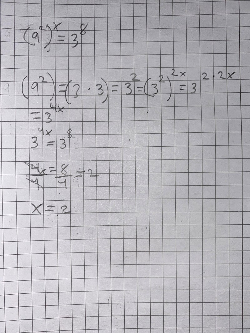 Vad är värdet på X om följande likhet gäller: (9^2)^x= 3^8