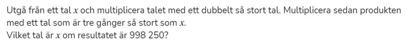En ledtråd är att ett tal dubbelt så stort som x är 2x. Och att ett tal som är tre gånger så stort som x är 3x. För att lösa talet behöver du veta hur x-tal multipliceras, sedan är det bara att ta kubikroten ur!