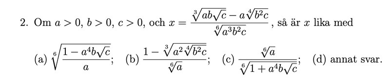 börja med att sätta in a=b=c=1 och direkt utesluta alternativ c eftersom det inte blir 0.