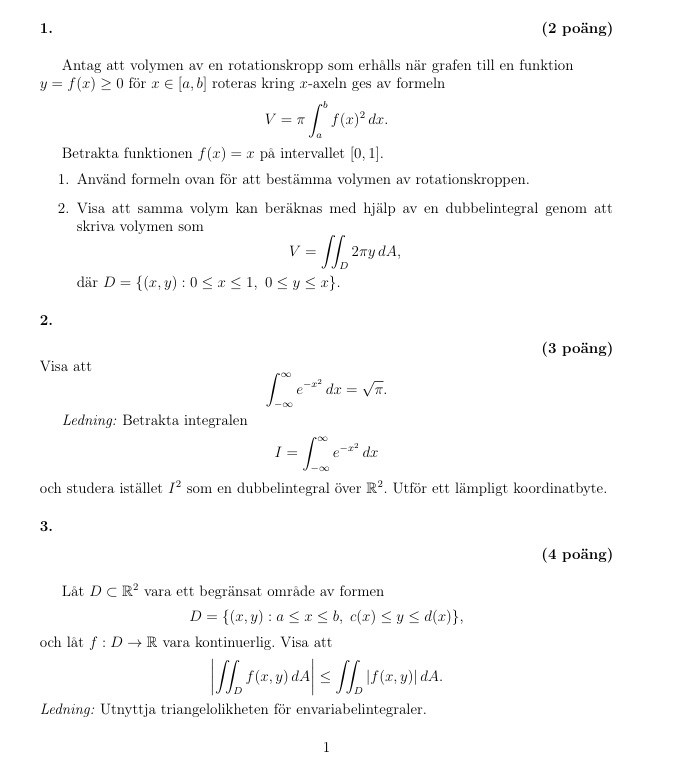 naytte skrev:Jag tycker inte den första uppgiften kräver särskilda verktyg utöver definitionen av integralen/dubbelintegralen och en del spatialt tänkande.