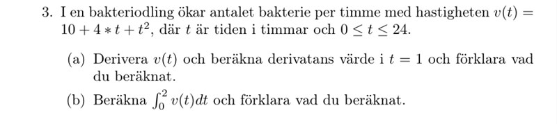 Matilda123 skrev:Så derivatan vid t=1 betyder att de ökar med (svaret av funktionen) vid en timme?