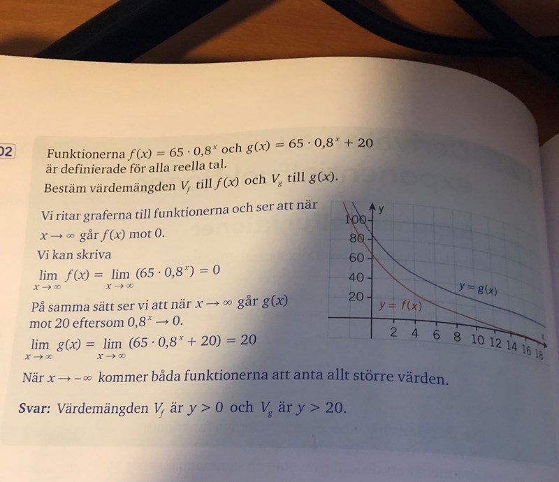 Min andra fråga är vad de menar med ”När x => - ♾ kommer både funktionerna att anta större värden” ”Värdemängden Vf är y>0 och Vg är y>20.”