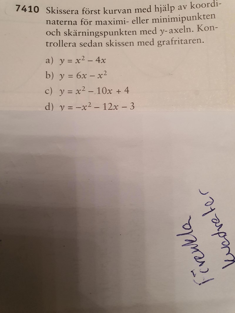 Bookworm skrev:Skärningspunkt med y.axeln är där y-värdet är noll. I a) är det då 0=x^2-4x och du kan då lösa vad x är för att sätta det som en punkt när du skissar grafen,