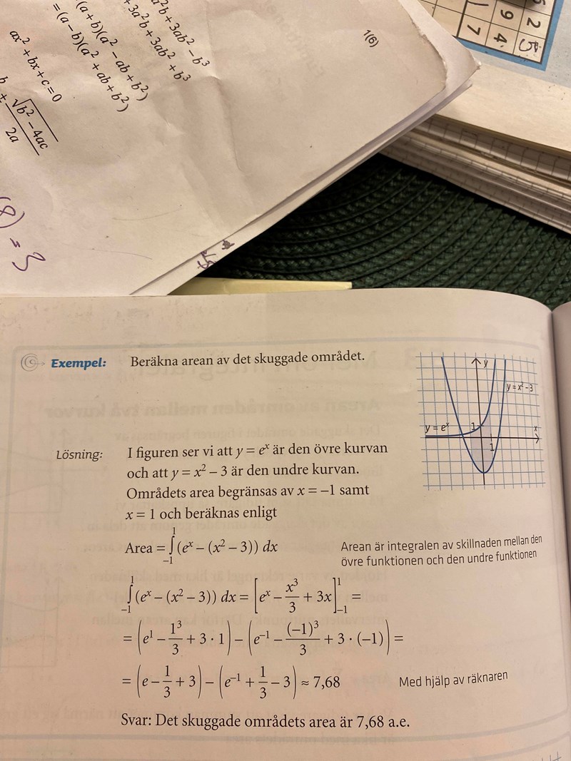 Det står att arean av den skuggade områden är skillnaden mellan integralerna av den övre och den undre funktionen. Men hur ska jag tänka mig när jag ska lösa eller hitta skillnaden mellan integralerna av den övre och den undre funktionen?