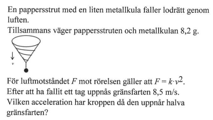 Nichrome skrev:Smaragdalena skrev:När hastigheten är 8,5 m/s är den bromsande kraften och tyngdkraften lika stora. Ställ upp en ekvation som beskriver detta.