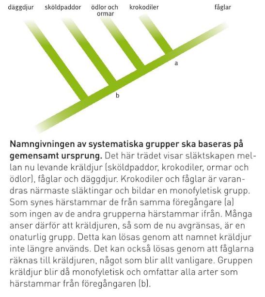 Enligt boken är en grupp monofyletisk om gruppen innehåller alla arter med samma förfäder, dvs. "alla grenar från en gemensam förfäder ska vara med". Detta betyder att systematiska gruppen reptiler är en icke-monofyletisk grupp, eftersom gruppen reptiler tar inte med fåglar, vilket har en gemensam förfäder.