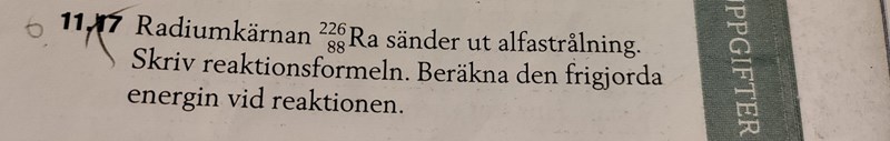 http://nucleardata.nuclear.lu.se/toi/nuclide.asp?iZA=880226Så om jag fattat ditt svar rätt så blir den frigjor´da energin på denna uppgift både det nya grundämnet samt strålningen.