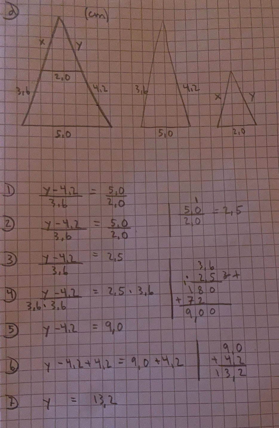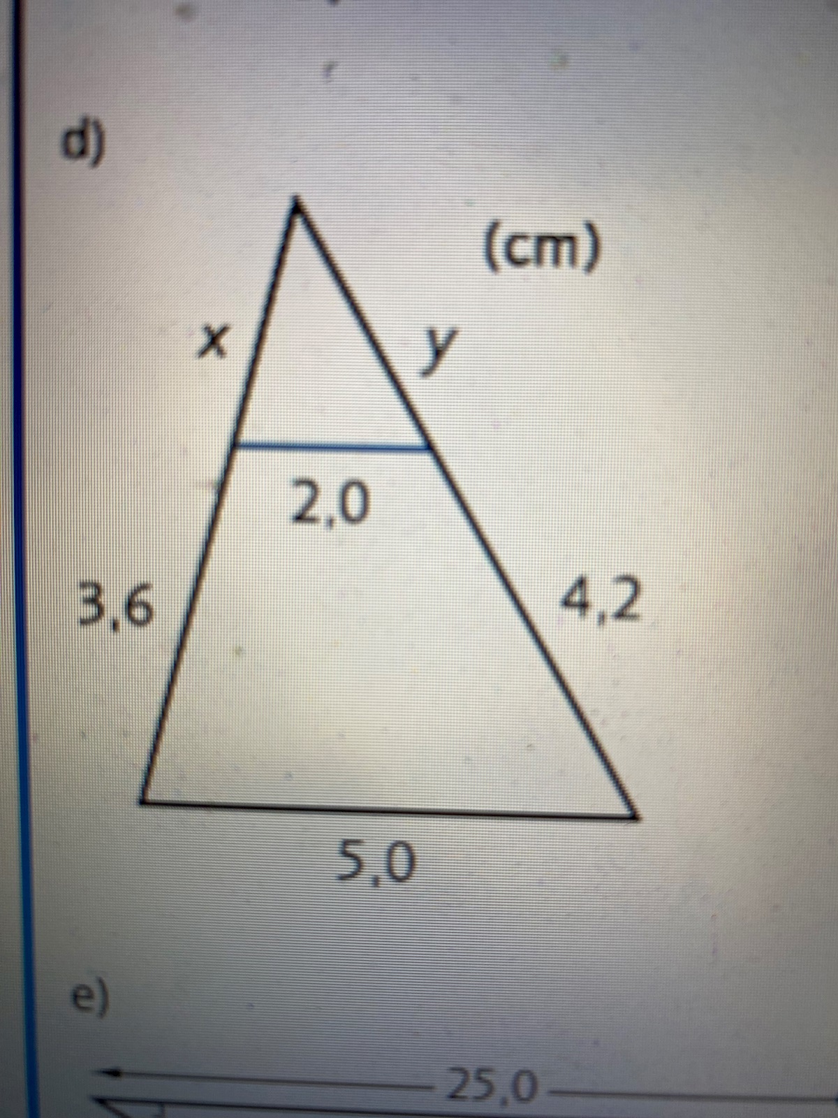 Vi får förutsätta att sidan med längden 2,0 cm är parallell med sidan med längden 5,0 cm. Då blir trianglarna likformiga och uppgiften går att lösa.