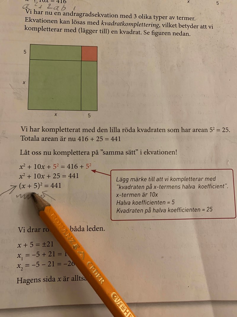 När man utvecklar en parentes av typen (a+b)^2 blir det a^2+2ab+b^2. Har ni gått igenom hur man multiplicerar parenteser med varandra?