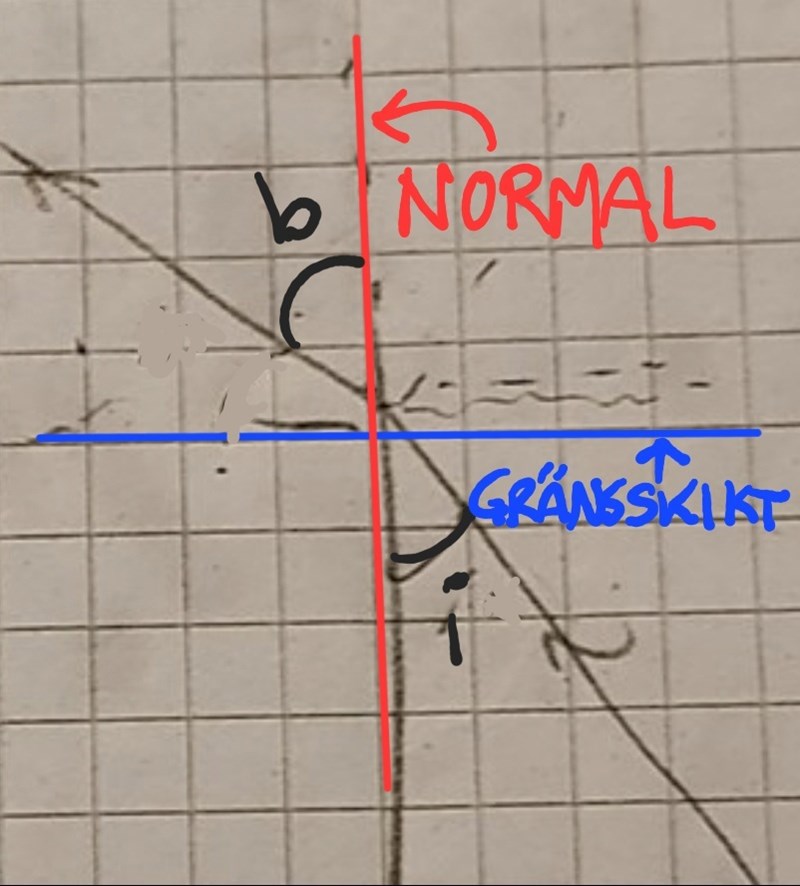 Du har rätt, men hur? Det blir inte desamma, min nya fråga är varför jag vanligt vis kan rita normalen vinkel rät mot mediumet, men i denna uppgift inte?