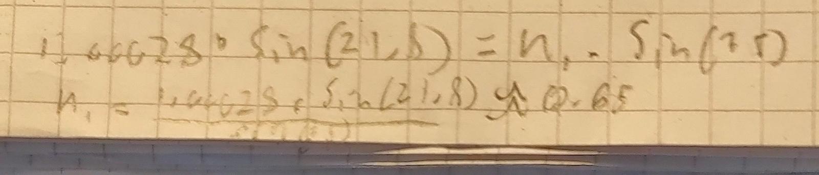 Men om vi fastslår att de senaste givna vinklarna stämmer, bör inte brytnings lagen där 1.00028*sin(21.8)=n*sin(55) ge rätt svar?