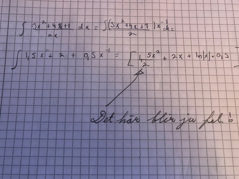 Hahaha, några tips på att skriva finare matte? Ja det stämmer ju inte med facit, det jag har markerat ska ju egentligen bli x inte 1,5/2x^2