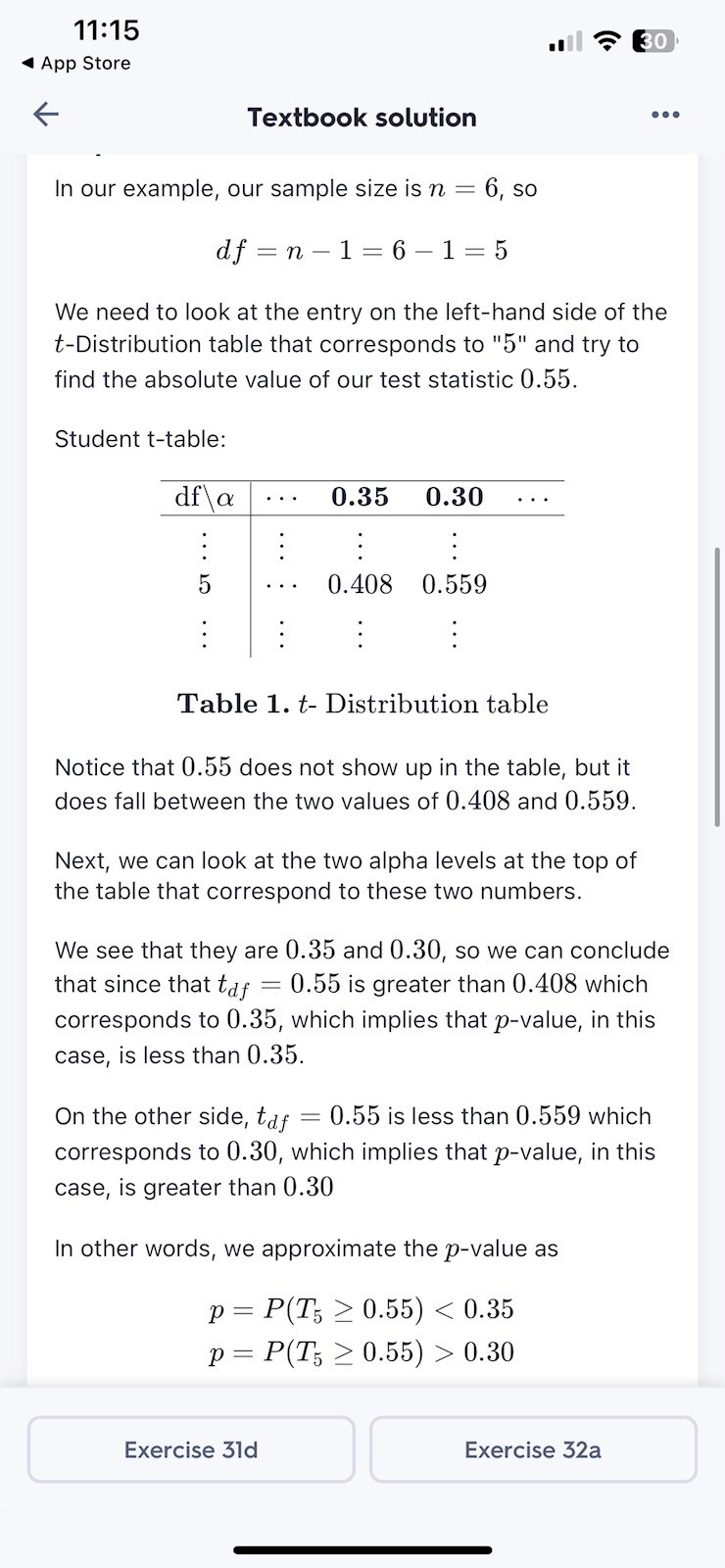 Ok, den tabell du har verkar vara för one-tailed. Så eftersom df=34, det är ett two-tailed test och t=1.483 så verkar p-värdet vara mellan 0.1 och 0.2 enligt din tabell (1.483 ligger mellan =0.05 och 0.1, så eftersom det är ett two-tailed test så multiplicerar jag med 2 och får att det ligger mellan 0.1 och 0.2).