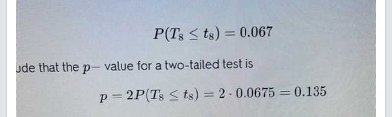 Nvm det var aldrig ett two tailed test, jag kollade fel. Jag orkar inte posta hela frågan och lösningen igen men jag har försökt att förklara så bra som möjligt efter ditt svar med "I den första bilden tar de det gånger 2 i Excel, när jag räknar det för hand så behöver man inte ta det gånger 2. Man kan se lite skillnad mellan den andra bilden och första, man ser att de tar 0,0675*2=0,135. Detta för att test statistiken är -1,66 (negativ). Kollar man första bilden så behöver man inte göra något mer efter att man fått reda på 0,031. Man ser även att det är en positiv test statistik med 2,218 ( alltså ska man inte ta *2.").