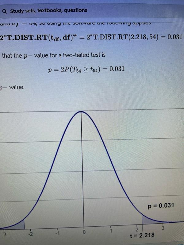 Om du tittar på bilden ovanför. Man har observerat t=2..218. Det är ett two-sided test, så p-värdet är arean av de två blåa regionerna (både väldigt negativa och väldigt positiva värden räknas som extrema).. Så vad de gör är att de räknar ut den blåa regionen till höger (vilket skulle vara p-värdet i ett one-sided test), och sedan multiplicerar de med 2 för att även lägga till blåa arean till vänster (den är lika stor, därav multiplikation med 2).
