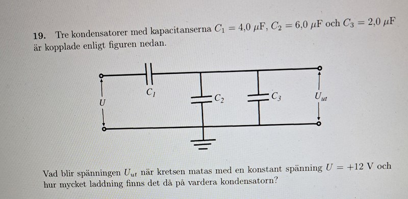 Man ska lägga ihop C2 och C3. Sen blir det i serie med C1 och då vet vi att Q=C1*U1=C23*U_ut sen vet vi att U=U1+Uut och man kan ersätta U1 med U-Uut för att sen lösa ut Uut. Sen är det bara att hitta laddningen för vardera kondensator