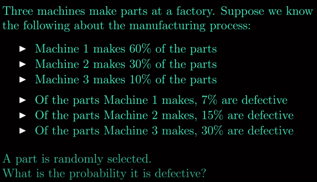 Det är kanske lite underligt att tänka på frågan på detta sätt. Jag skulle bara tänka som ni i tidigare inlägg att händelsen att en del är defekt är beroende av händelsen att delen var producerad av en viss maskin, och antingen göra ett träddiagram (egentligen onödigt) eller använda lagen om total sannolikhet (precis det du gör i din intuitiva beräkning). Formellt det är det dock ordnade par i utfallsrummet.