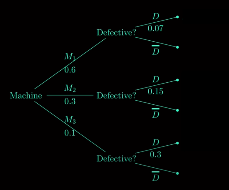 sedan två grenar från varje maskin (defekt, perfekt) med de i texten angivna (betingade) sannoliheterna.