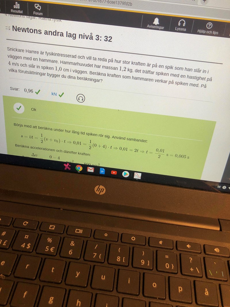 Jo men jag vill veta hur man kommer fram till det. Det du har markerat i är själva facit. Kan man anta att det är 4 m/s när man slår in den och därför är det starthastigheten. Sen så vet vi inte sluthastigheten eftersom när man slår in spiken så knuffas den in med 1cm vilket betyder att hastigheten kmr bli ngt på slutet som vi inte känner till?