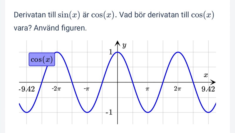 Hej. Rent generellt vet jag att derivatan av cos x är -sin x . Men jag vet inte hur jag ska använda figuren till hjälp