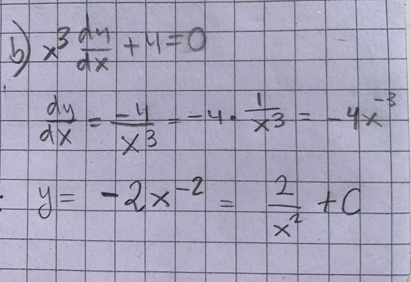 Hej! Undrar varför det inte ska ha ett minustecken framför 2/x^2 . ska bestämma lösningen till differentialekvationen