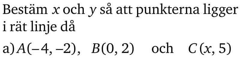 Hej! Uppgiften som finns bifogad nedan löste jag genom att rita in koordinaterna i ett koordinatsystem och jag fick svaret x=3 vilket enligt facit är rätt. Min fråga är om det finns ett annat sätt att lösa uppgiften på? En formel eller liknande. Tack på förhand!