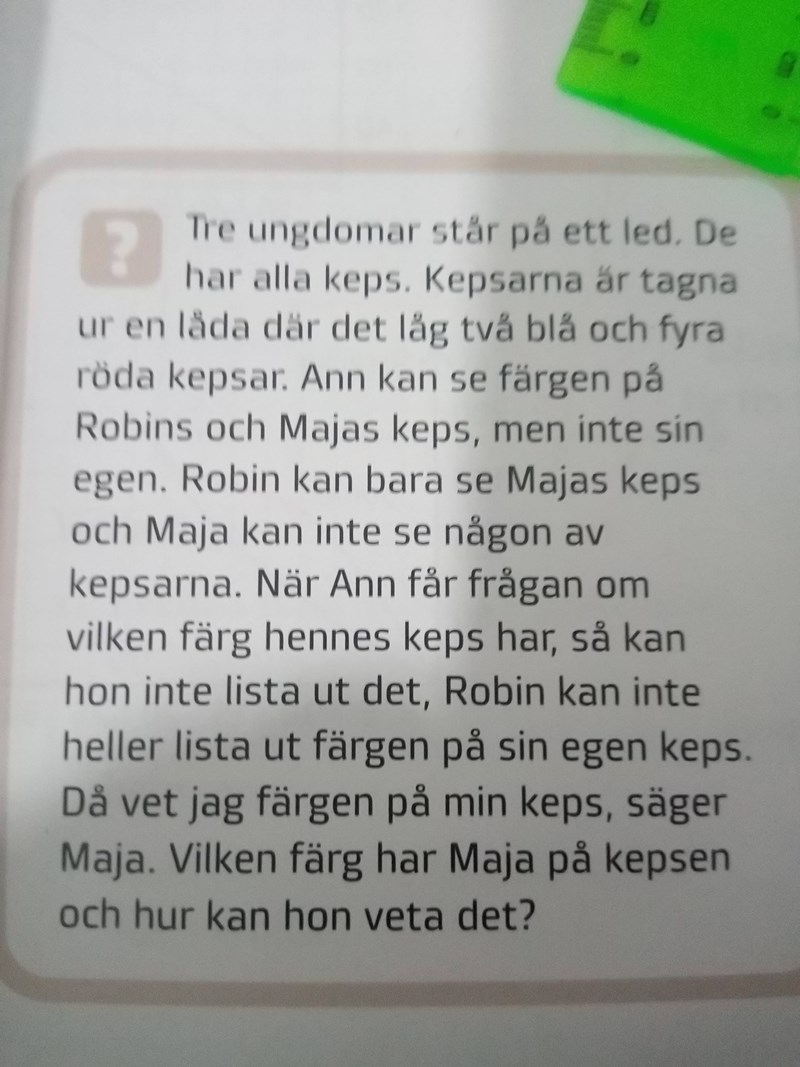 Om Ann hade sett två blå kepsar, skulle hon veta att hennse keps var röd (eftersom det inte fanns mer än 2 blå kepsar). Eftersom Ann inte kunde veta vilkenfärg hennes keps har, vet både Robin och Maja att Ann inte ser två blå kepsar. Om Robin hade sett att Maja hade en blå keps, så skulle han veta att hans egen keps var röd (för om Ann hade sett två blå kepsar skulle hon ha vetat att hennes egen keps måste vara röd). Nu säger Robin att han inte vet vilken färg hans egen keps har, och alltså måste Majas keps vara...