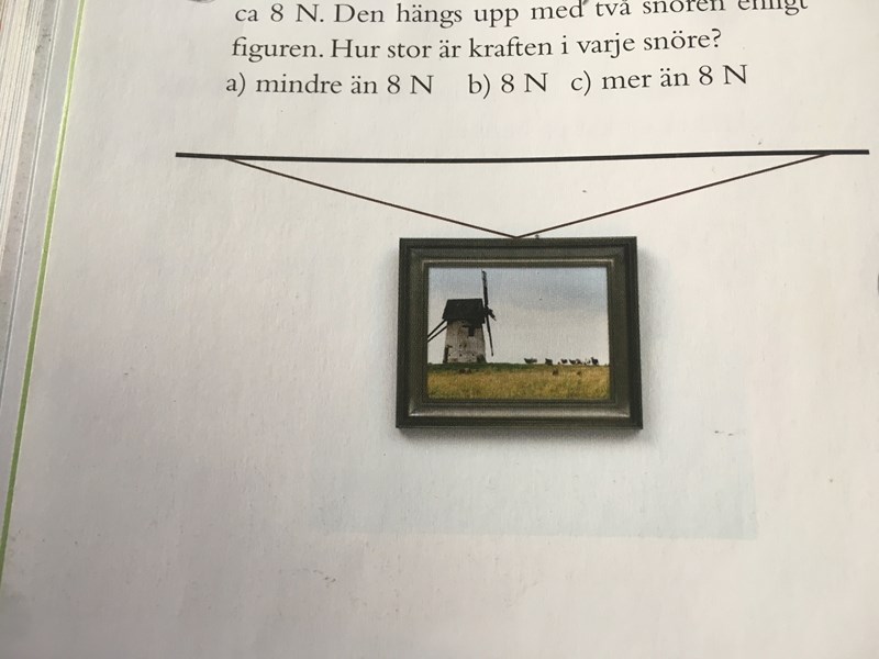 Ifall tavlan på bilden väger 0,8 kg och detta ger en tyngd på ca 8 N, varför blir då spännkraften i varje snöre mer än 8 N då?