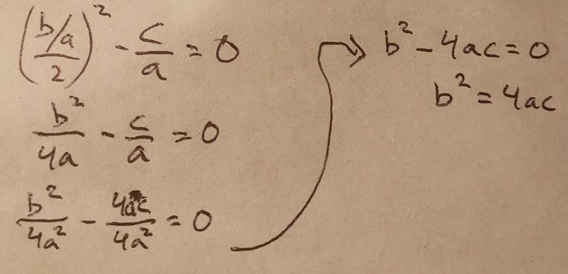 PATENTERAMERA skrev:b2 = 4ac är samma sak som c = b2/(4a). Men du hade fått det till b2 = 4ca2, som inte är samma sak.