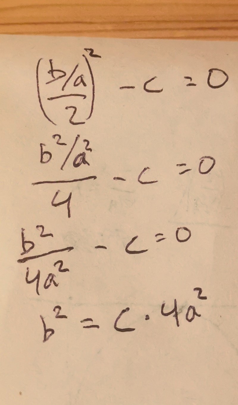 b2 = 4ac är samma sak som c = b2/(4a). Men du hade fått det till b2 = 4ca2, som inte är samma sak.