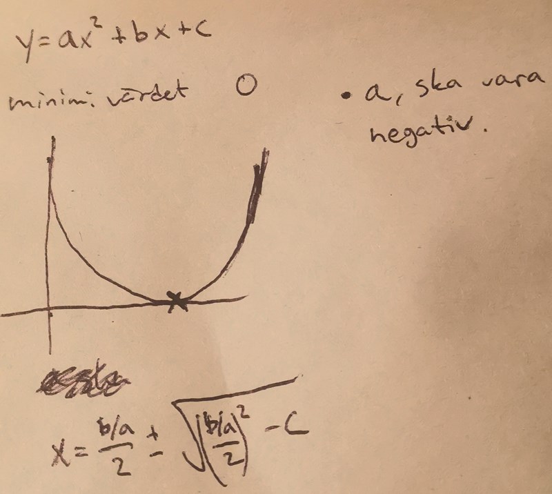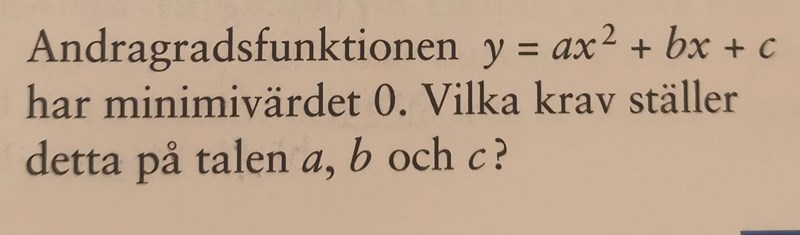 Groblix skrev:Japp. Rotuttrycket ska bli = 0. Då får du 2 lösningar där båda ligger precis på varandra i . Nu måste du bara bestämma tecknet på a för att få en minimipunkt där (inte maximi). Testa att skriva in samt på en räknare eller dator. Vad kan du dra för slutsats?